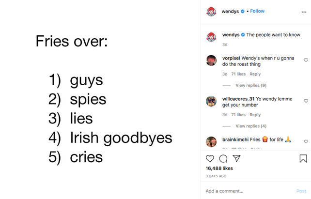 Another restaurant known and loved for its sparkling wit on social media is Wendy’s. The brand also doesn’t shy away from quick-fire repartees with their followers from time to time, making their Instagram not only engaging but absolutely entertaining. Kurt Kane, Wendy’s executive vice president and chief concept and marketing officer once called the brand’s voice “sassy” and no one could’ve offered a better description. By speaking the language of their primary target audience—young millennials, Wendy’s has managed to become quite the social media sensation. Comments from followers such as, “Wendy's when r u gonna do the roast thing?” prove how customers can’t seem to get enough of the brand.