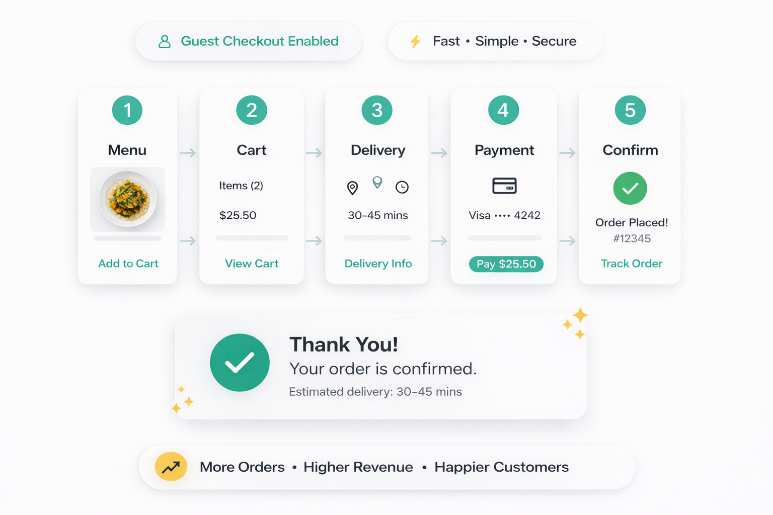 And make sure guest checkout is enabled in your ordering platform settings (most platforms label this under Checkout or Account Requirements). The only screens a customer should see are: menu, cart, delivery details, payment, confirmation.