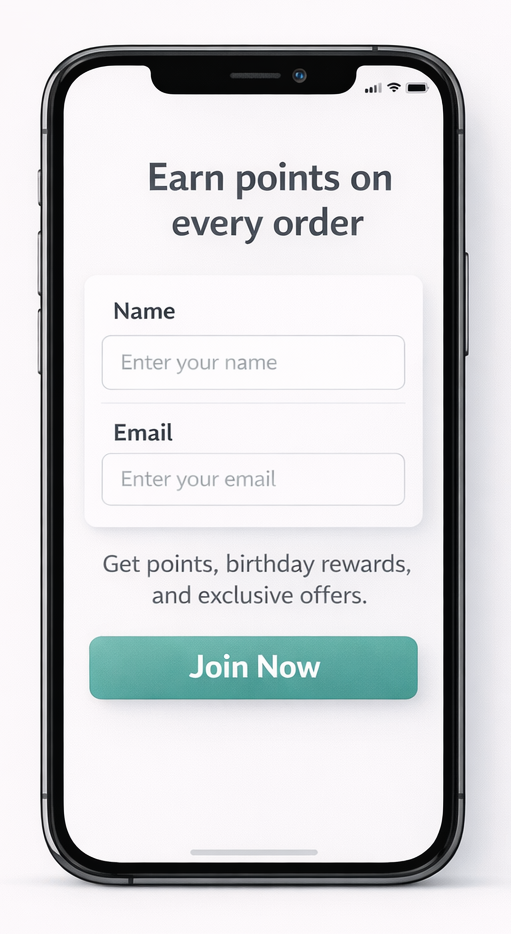 Add a simple signup option for offers, updates, and rewards in visible areas people naturally notice, such as the header, footer, or near key sections like your menu or ordering page.