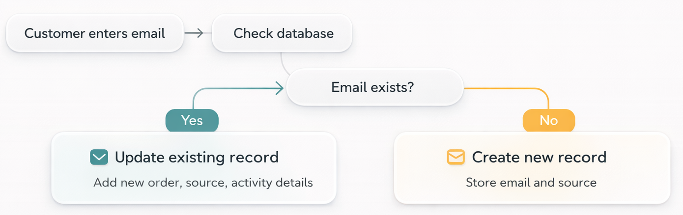 Now, all of these are separate interactions, but they all belong to the same customer. Each new action should update the existing record instead of creating a new one.