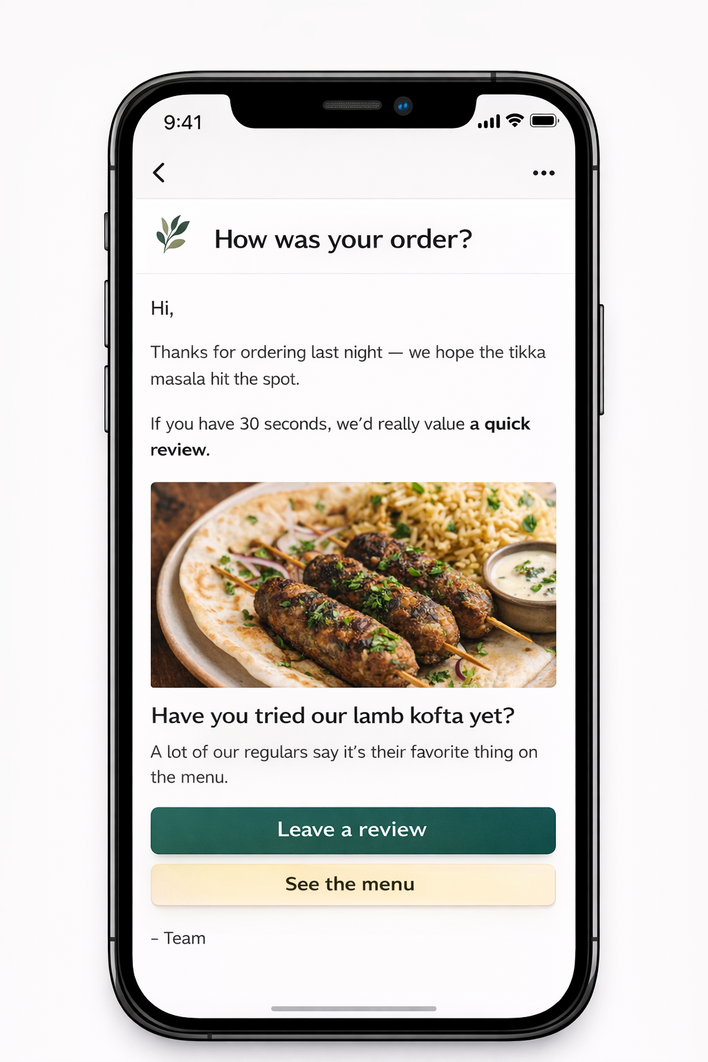 - Email 2 (day 3): Highlight two or three dishes that customers order often. Add a short detail that helps them understand what makes one of them worth trying.