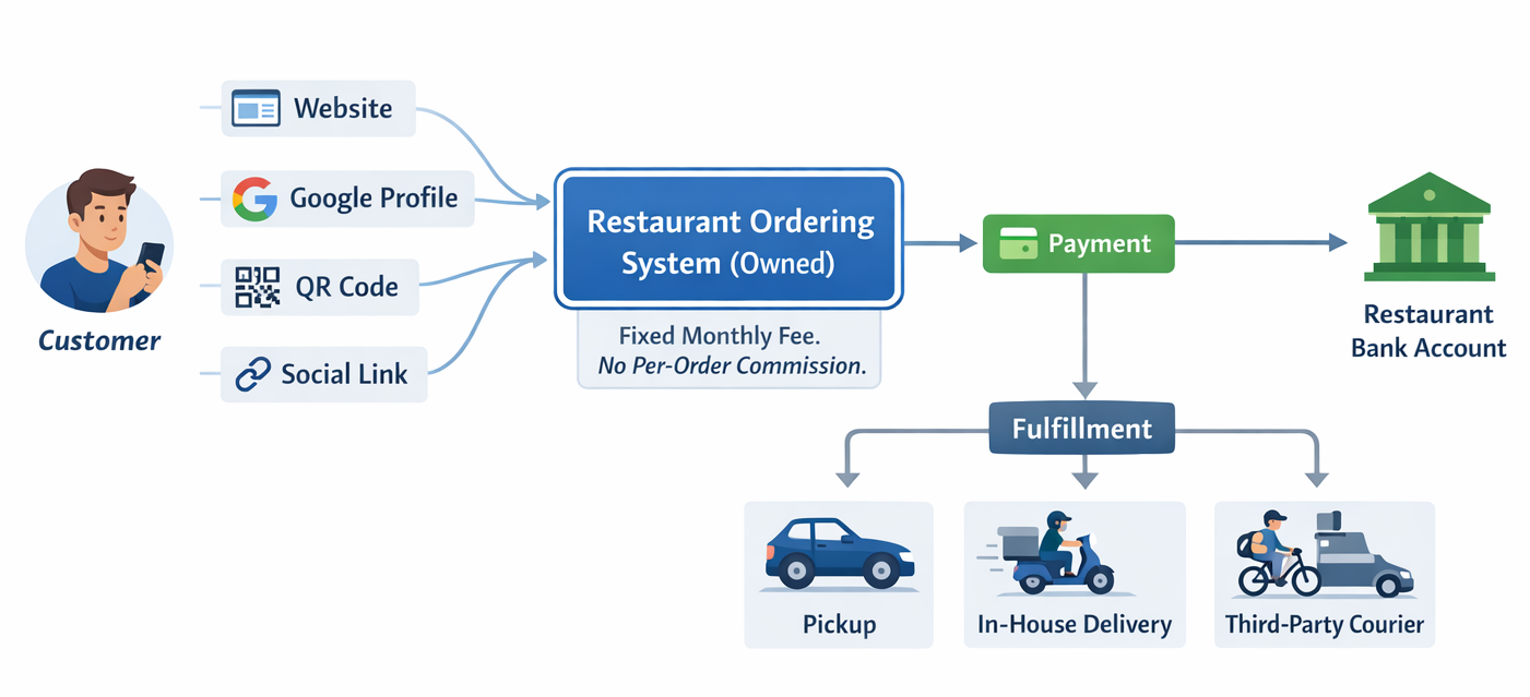 - Customers order through links you control: your website, branded page, Google profile, QR codes, or social media